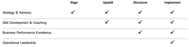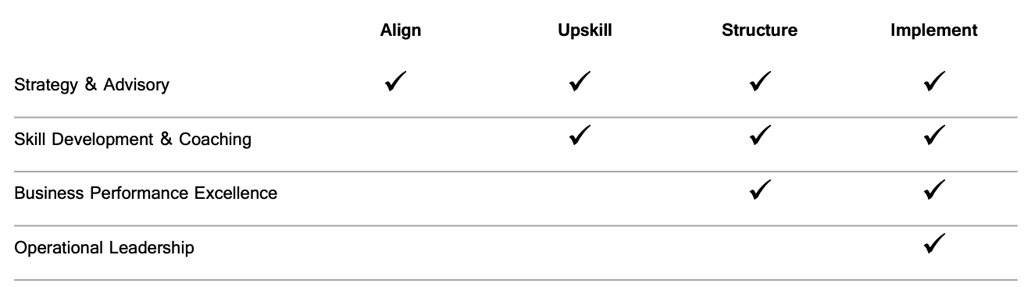 Misalignment between vision, strategy, and execution can derail progress. The Align offering ensures everyone is on the same page, with clear goals and accountability mechanisms in place.